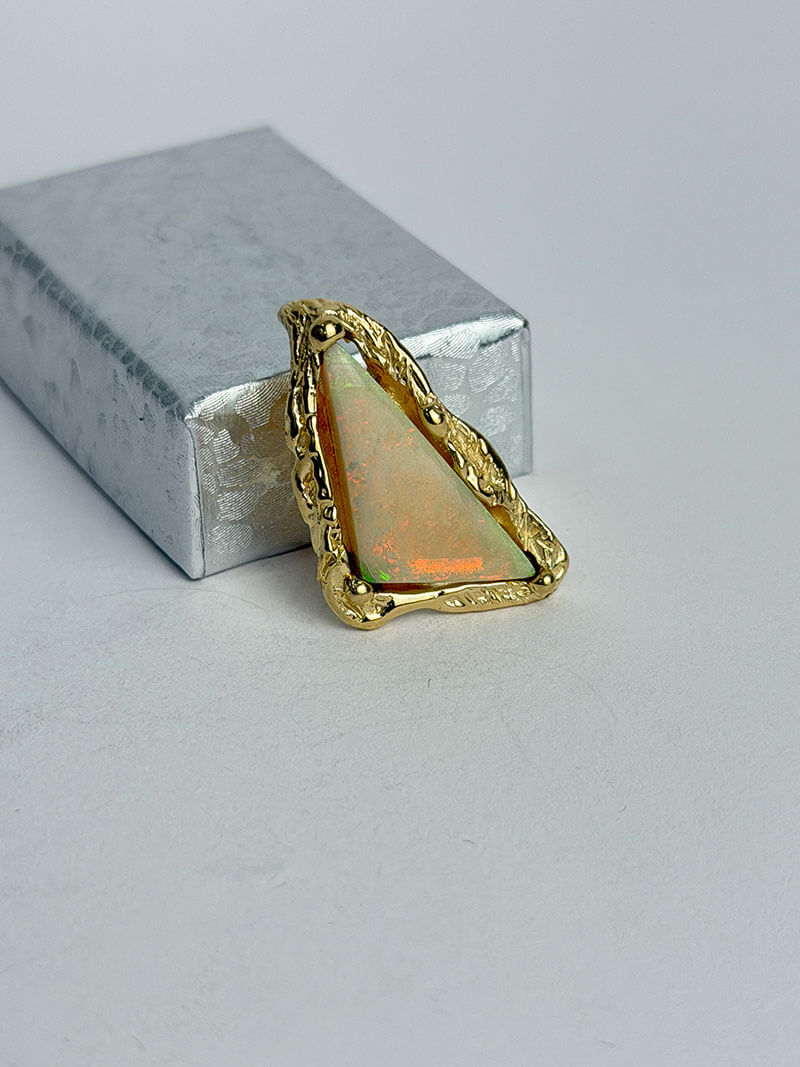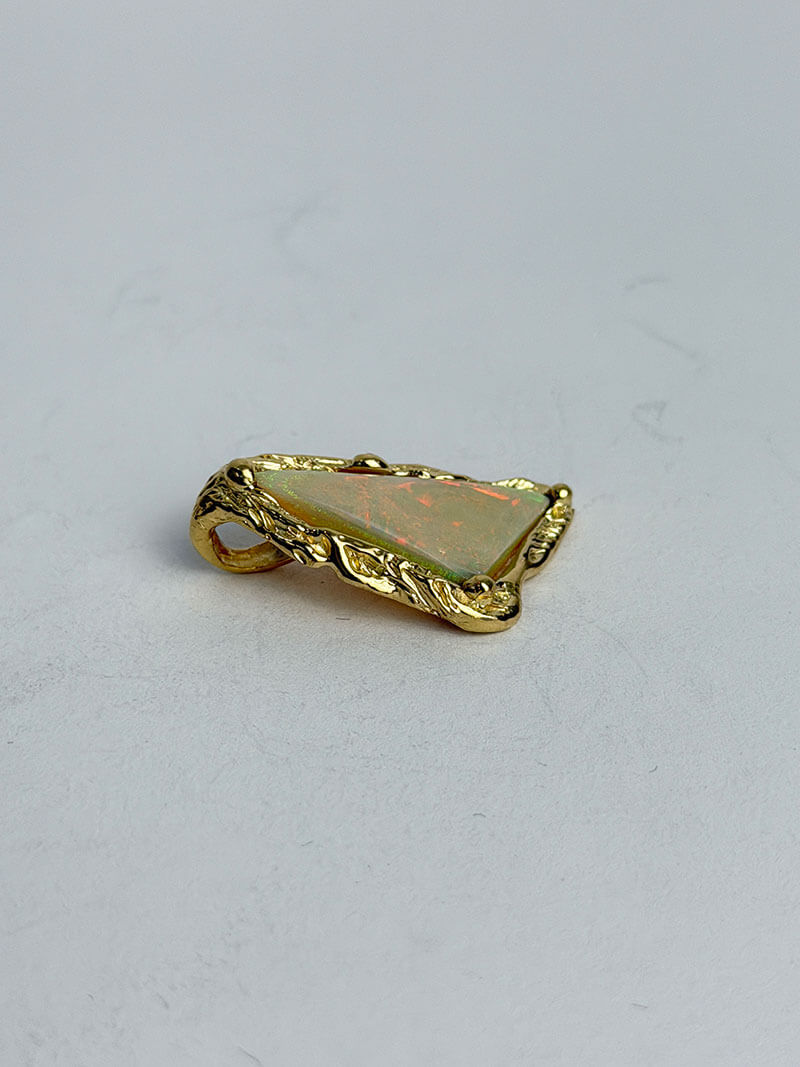 Some pieces fade away with time; others become the safekeeping of a family legacy. The Aureum Trinity Opal Pendant is the latter. At its heart lies a 5.5 carat Mexican opal with a free-form triangular cut, revealing intense flashes of fiery orange, gold, and subtle green that seem to dance with the light. The gem is encased in a 18K yellow gold frame, entirely handcrafted to achieve a visual balance that feels both ancient and contemporary.
