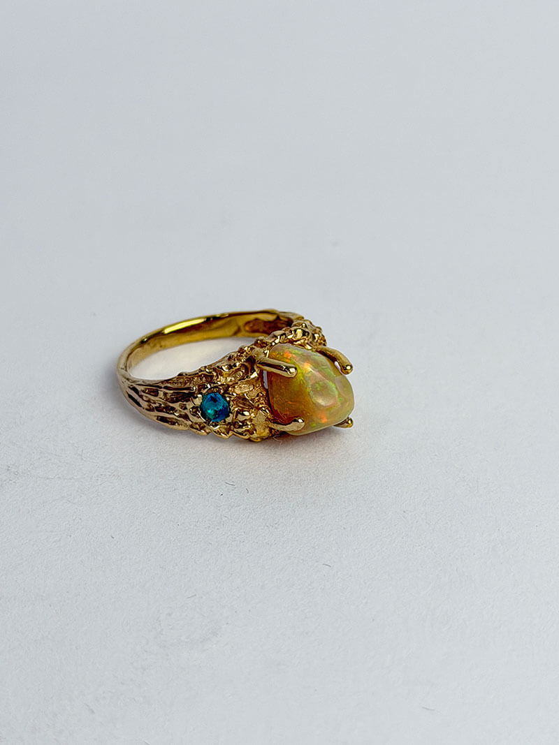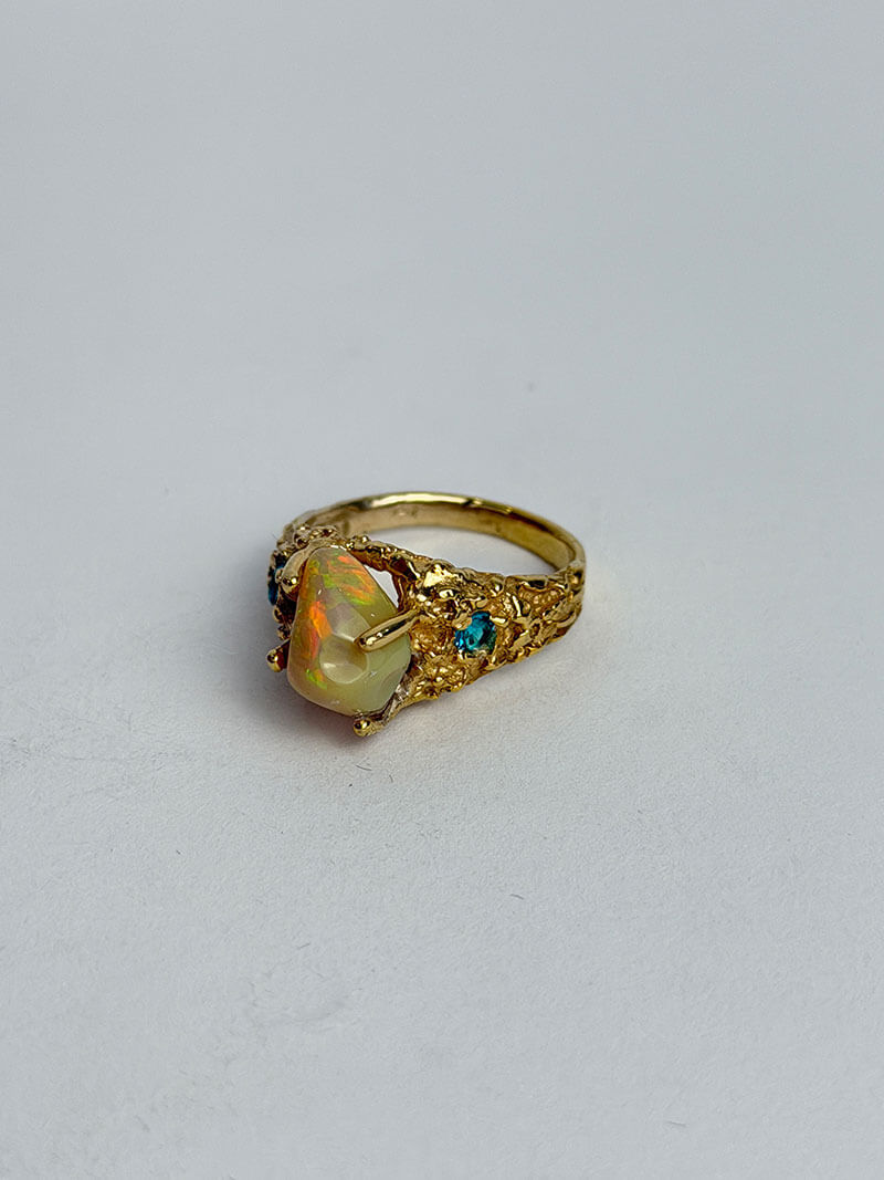 There are truths that can only be understood after you’ve lived through it all. The Celestial Relic Ring was born as a physical reminder of that clarity. At its heart lies a 3.5 carat natural Mexican (freeform) opal a gem that refuses to be tamed by traditional cuts. Its flashes of fiery yellow and emerald green emerge from the depths of the stone, symbolizing those moments of revelation where intuition and experience finally align.